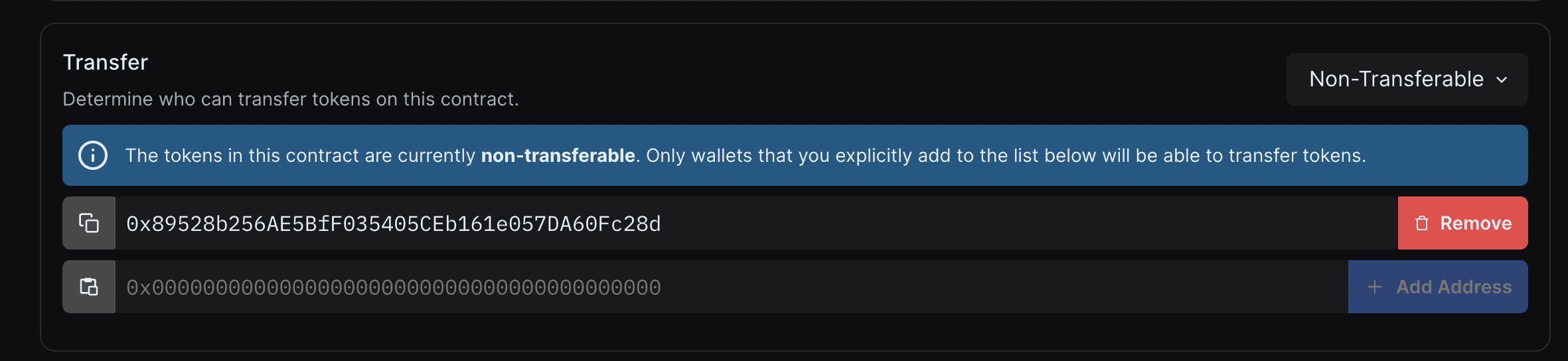 The easiest way is via the Permissions tab on your thirdweb contract dashboard. For a visual walkthrough, check out our guide on making NFTs non-transferable.